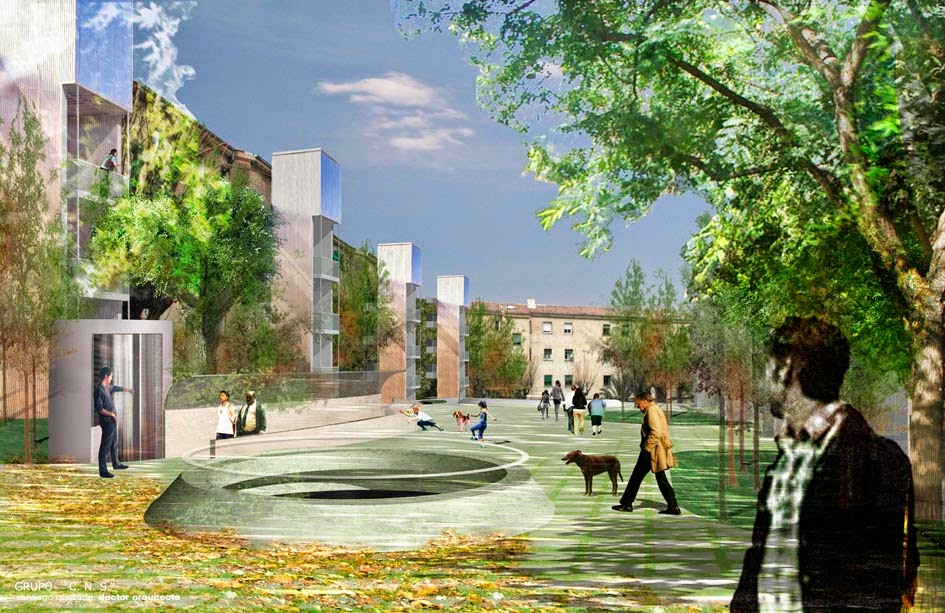 2.- Para conseguir la idea de configurar este barrio como un nuevo pulmón verde de la ciudad, será un objetivo primordial de la propuesta en todos los grupos de las Viviendas Protegidas, la ordenación y reurbanización de los espacios libres interiores de los cuatro grupos de viviendas.